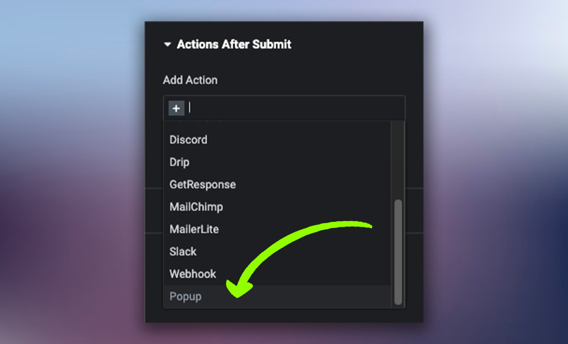 Now, locate the form within your popup. On the Elementor left sidebar, where all the settings are located, navigate to “Actions After Submit.” From the list of options, choose “Popup” and add it to your selection.
