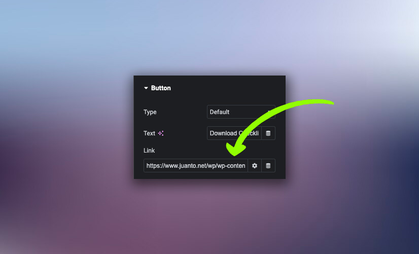 Now, paste your file URL into the button link field. However, if we were to end here, the file would still open in your browser. That’s why we need to proceed by adding a custom attribute to enforce the download.